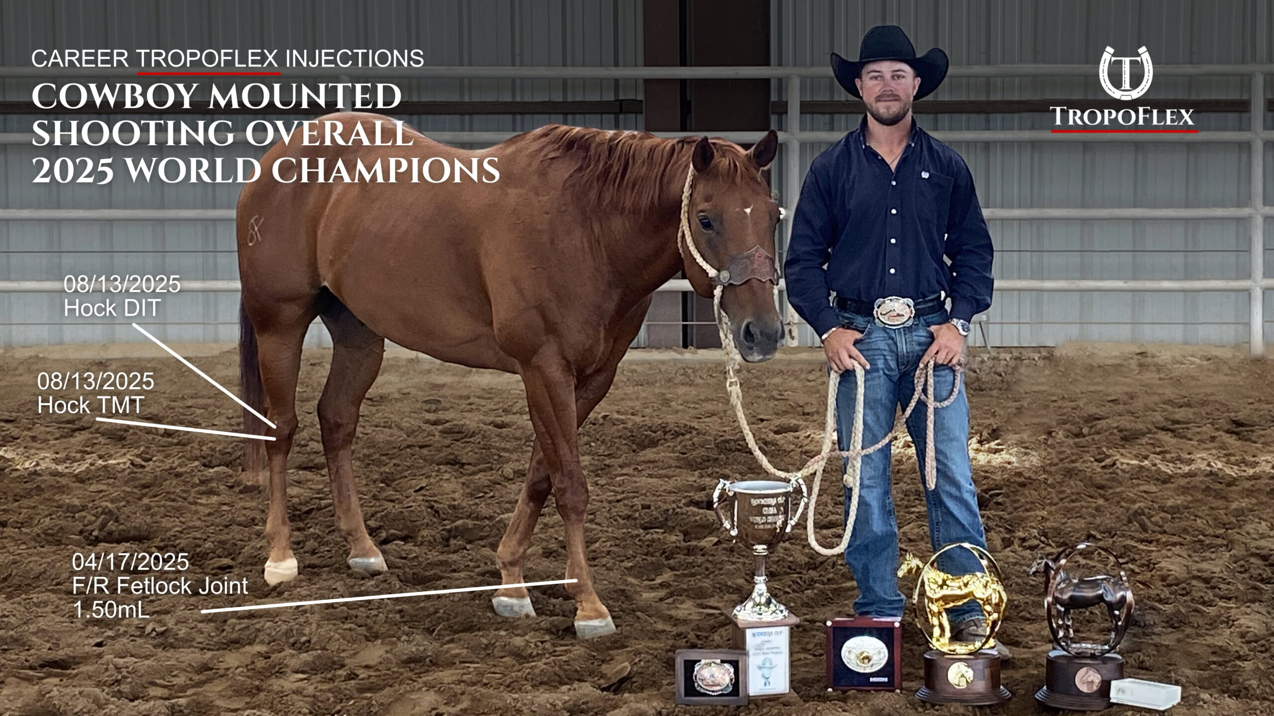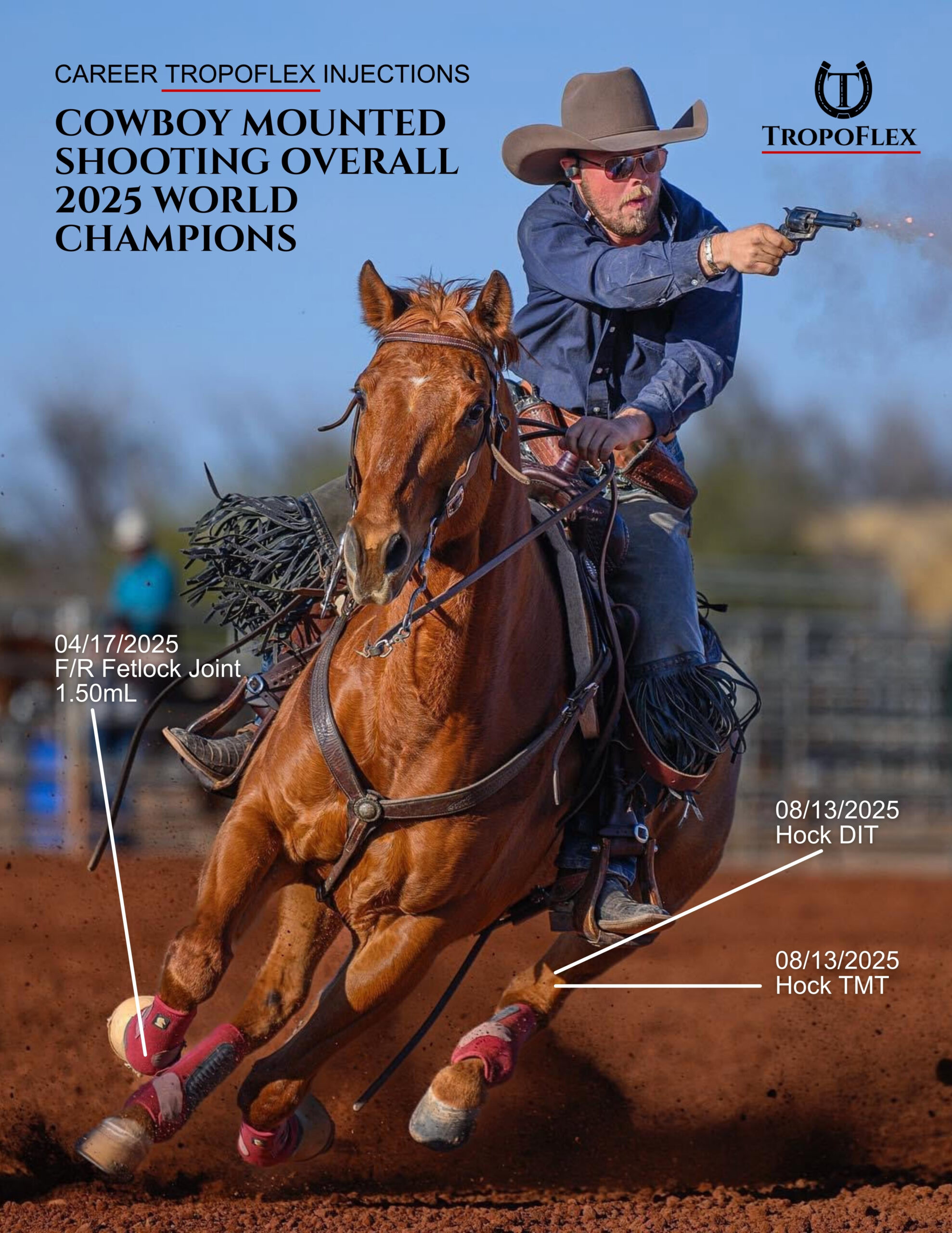 Testimonials Overall, my experience with TropoFlex has been phenomenal.Dr. Teri Todd, DVM, Harrisburg, SD I would not feel comfortable injecting anything else into a horse.Cynthia Niemela, MHCP, Equine Osteopath, EDO [Horse is] running and playing with her baby now. Absolutely amazing. TropoFlex gave back her life.Patti Olic, owner This horse is sound. Dr. Jeff Moss saved my horse’s life with TropoFlex.Sandy Ullman, Owner Tropoflex injected five months ago for Navicular. Now Rambo is a ZERO on the lameness scale.Steve Flint, Owner Dallas won the Mounted Shooting World Championship after injection.Ronai White, Owner No more swelling after competition! Prior to TropoFlex, we had to poultice and ice after competition. Placed in Amarillo competition!Owner: Ronai WhiteVeterinarian: Jeffrey Moss, DVMHorse: Athena Blaze had hocks and stifles done and she was a little sore with the stifles, but now she is AMAZING! She will be my number one in Vegas next week.Owner: Carrie HirshbergVeterinarian: Michael Sorum, DVMHorse: Blaze
